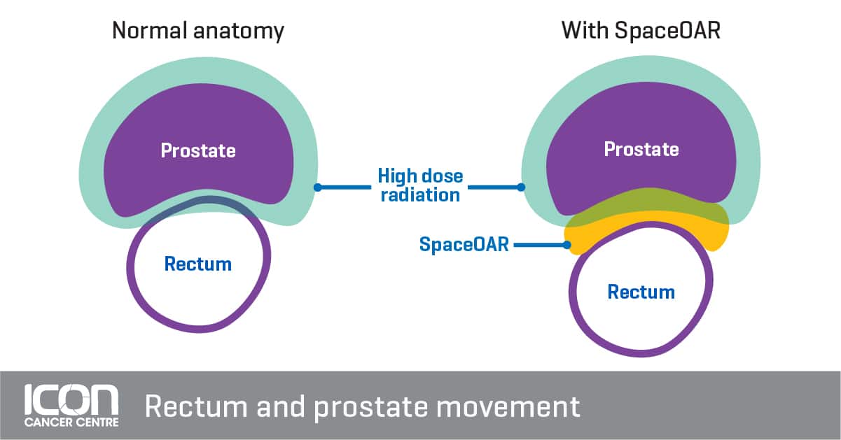 Hydrogel is a gel-like substance that is implanted between the prostate and rectum in a minimally invasive procedure by a urologist. At Icon, we use a hydrogel known as SpaceOAR Hydrogel. SpaceOAR stands for Space Organs At Risk, as it protects the rectum during radiotherapy treatment of prostate cancer to reduce the risk of potential side effects.
